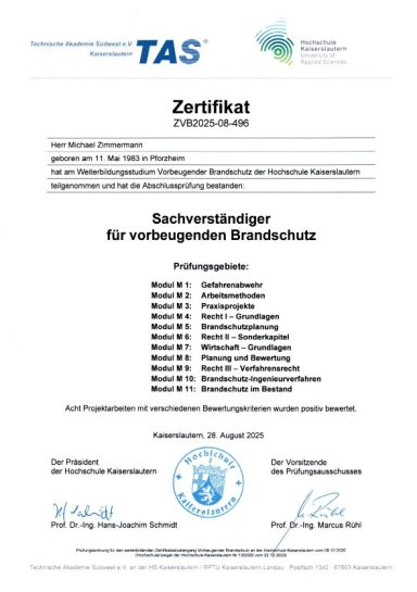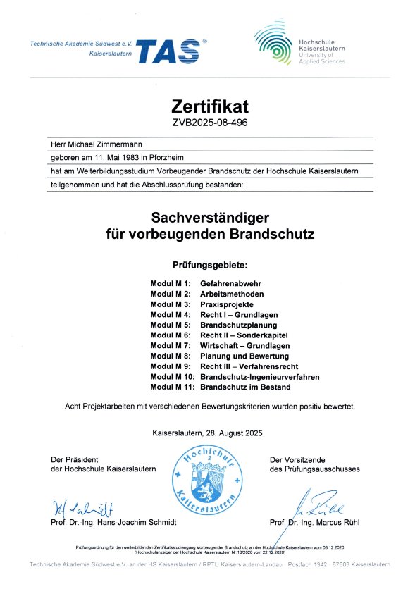 Angefangen von jahrelanger Erfahrung im Dienst einer freiwilligen Feuerwehr, über ständige Aus- und Weiterbildung bis hin zum Weiterbildungsstudium Vorbeugender Brandschutz an der TAS/Hochschule Kaiserslautern machen Zimmermann Brandschutz zu Ihrem optimalen Ansprechpartner in allen Fragen rund um den baulichen und organisatorischen Brandschutz.
